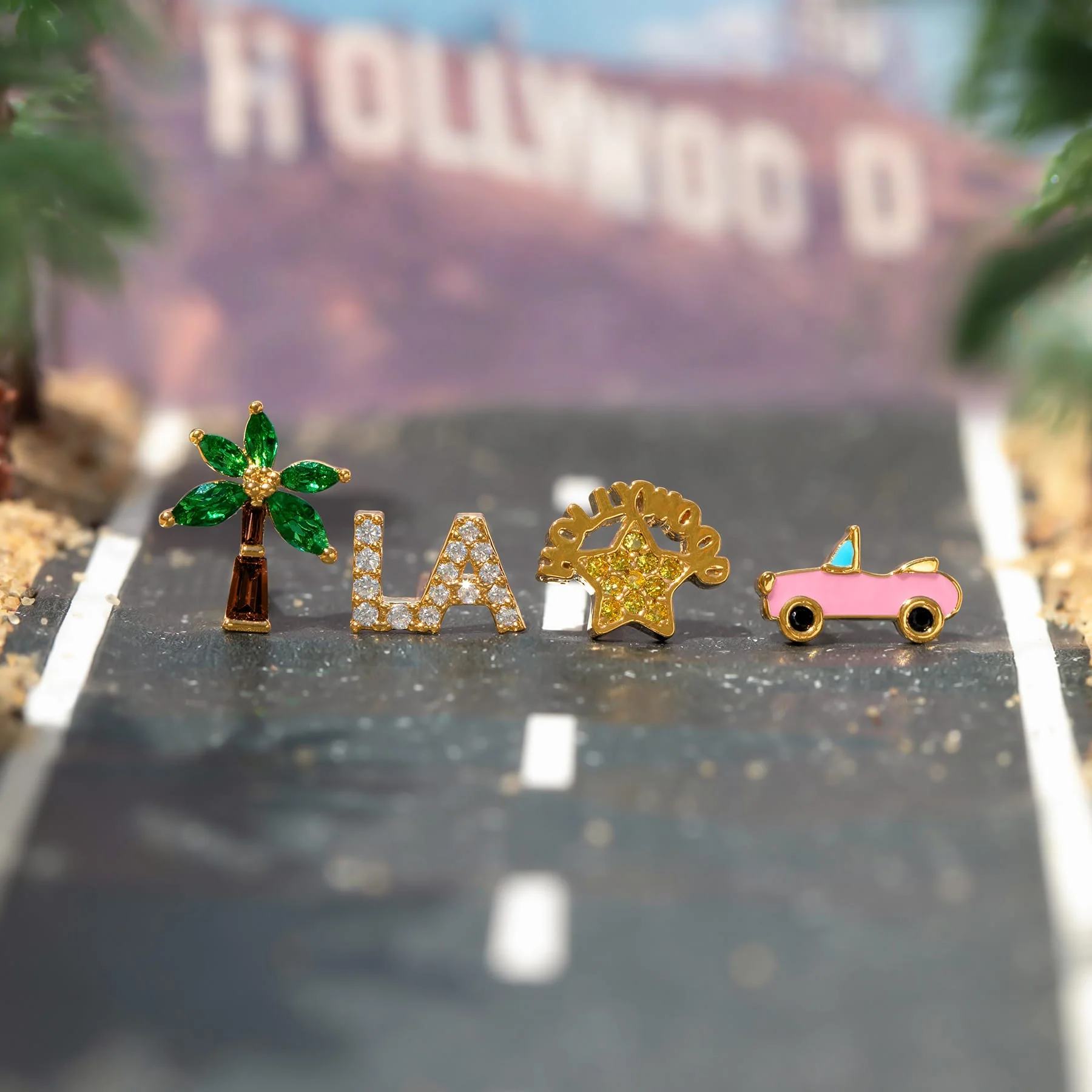 The City of Angels Stud Set is a love letter to LA, featuring LA studs, palm tree, pink convertible, and a Hollywood star. For anyone who’s got dreams bigger than their Insta feed and a love for sunsets and city lights. Wear these and make every day feel like you’re walking the Walk of Fame.
