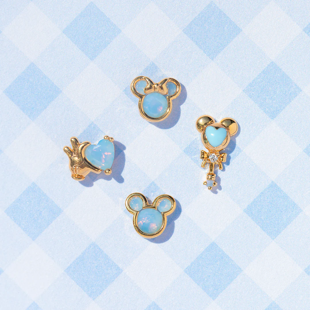 Immerse yourself in the enchanting world of Disney with this adorably dainty four-piece earring set. This set features timeless silhouettes of Mickey Mouse and Minnie Mouse, Mickey's iconic glove embracing a heart, and a captivating Mickey Mouse wand, all elegantly showcased in beautiful shades of blue. This stud set is an absolute must-have for every Disney enthusiast, infusing your everyday style with a touch of magic and whimsy. Experience the magic of Disney with this stud set, designed to capture your heart.
