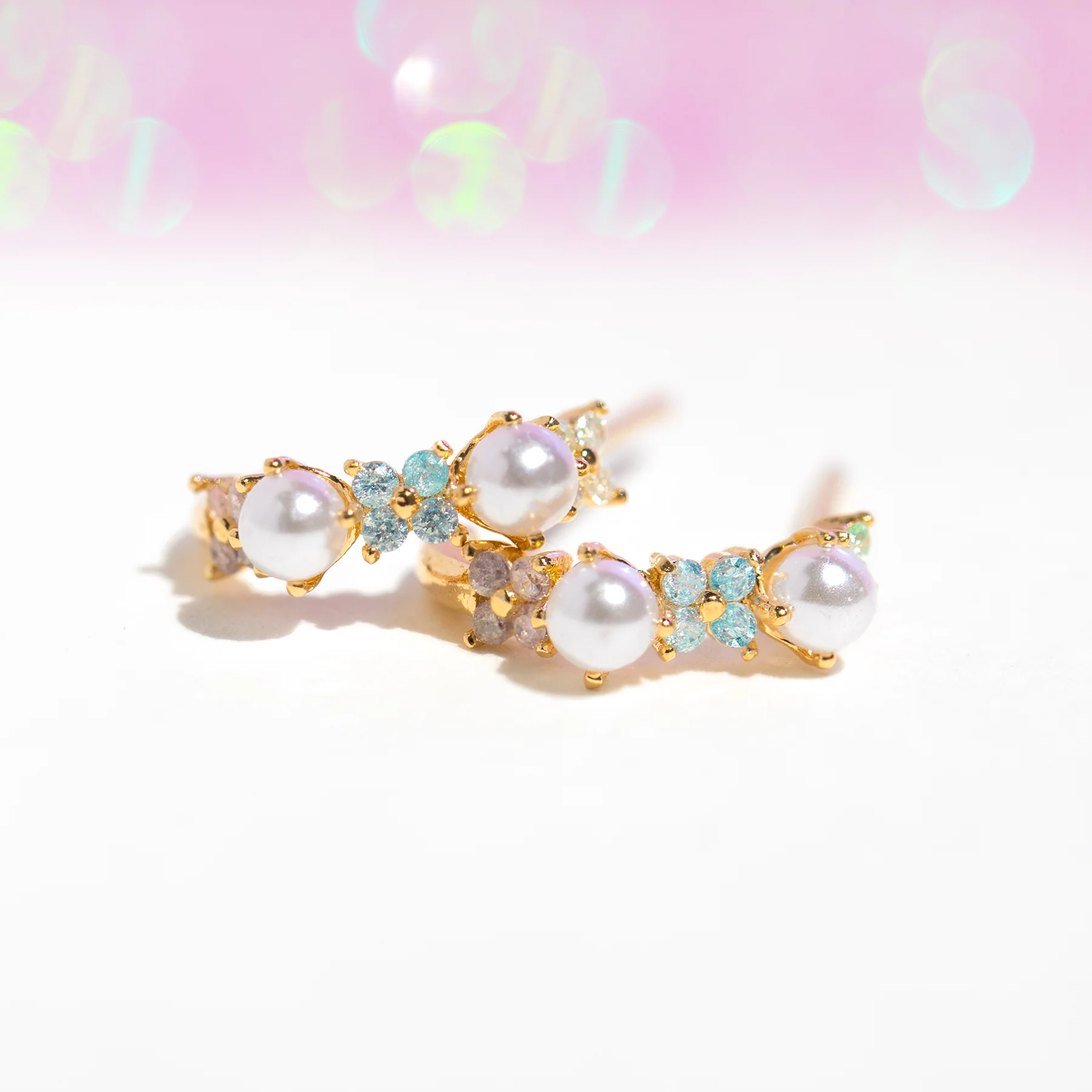 The perfect touch of delicate elegance. Our Pink Pearl Hoops feature two lustrous pearls and a dainty array of pastel-hued blossoms along the rim. Perfect for a casual day out or cocktail hour with friends, these versatile hoops are a must-have addition to your jewelry collection.