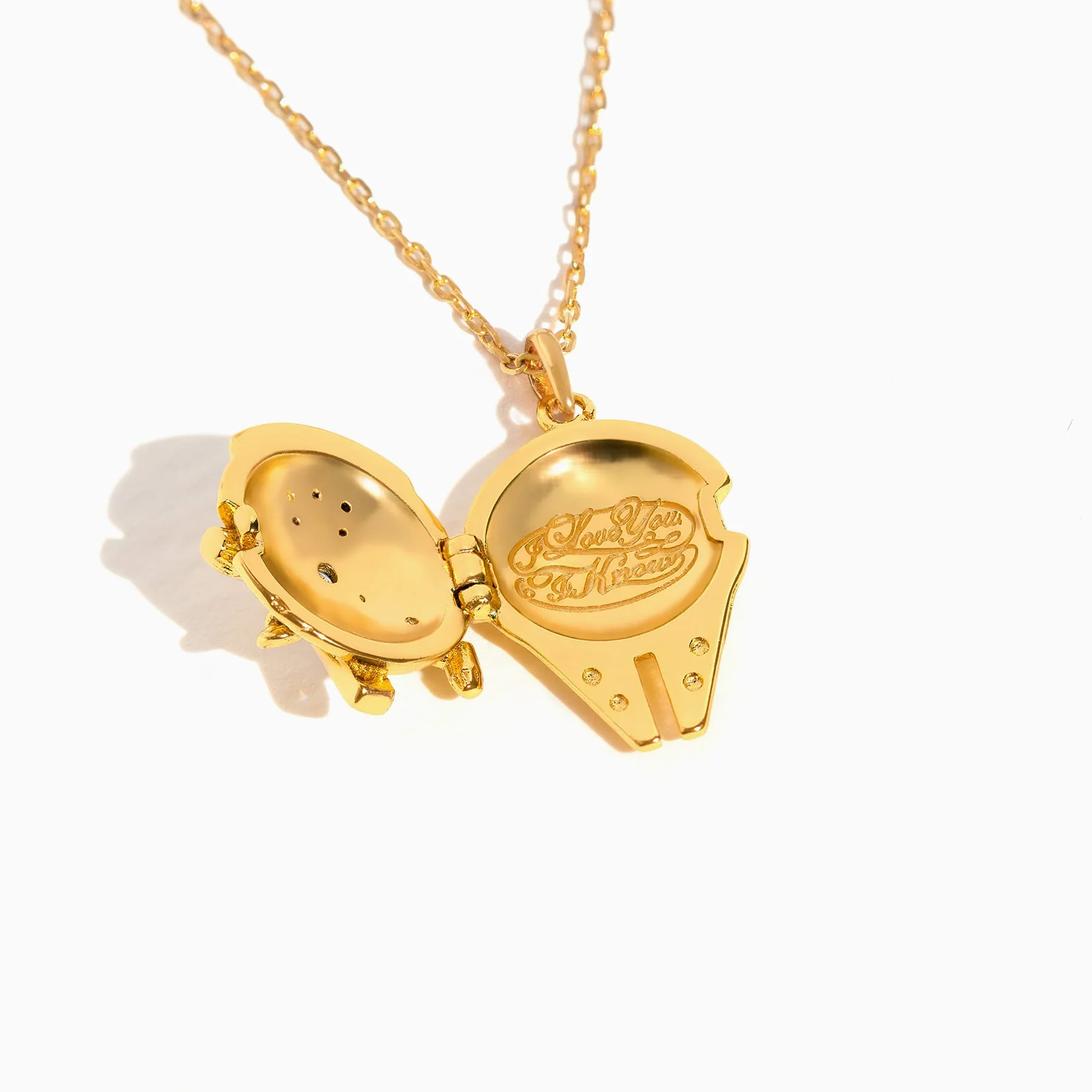 Our Star Wars⢠Millennium Falcon⢠Locket Necklace is a timeless keepsake for the woman who believes in love thatâs as strong as the galaxy itself. Engraved with "I Love You, I Know," this locket is a powerful reminder of the deep bond between Han and Leia. This locket features a delicate chain, perfect for pairing with the menâs version to create a matching set. Available in two versions, itâs the perfect way to carry a piece of your love story and the spirit of the Millennium Falcon⢠wherever you go.