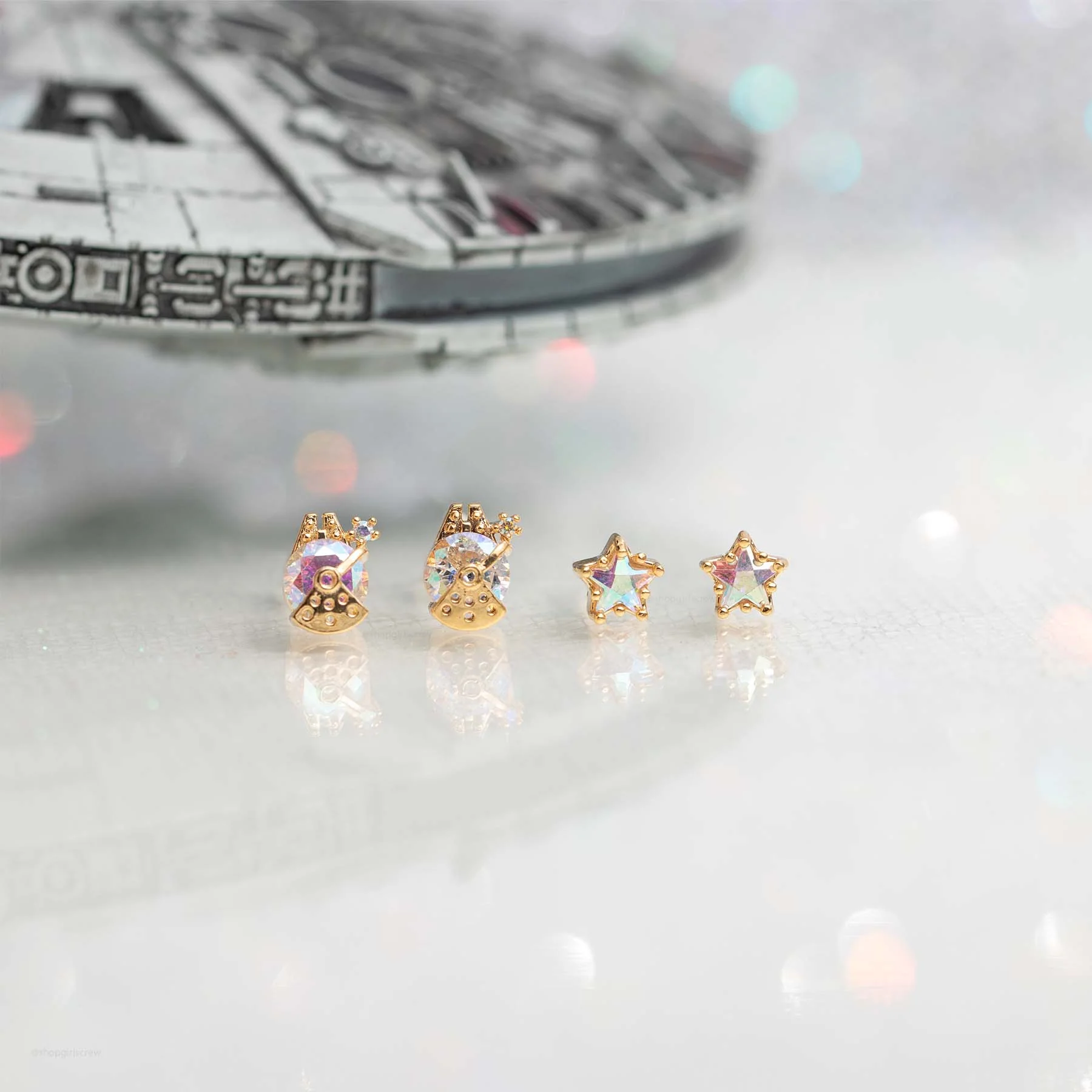 It's the fastest vessel in the galaxy! Inspired by her greatest victories with the Rebel Alliance, the Millennium Falcon⢠design finally joins the Star Wars⢠X Girls Crew collection. The Star Wars⢠Millennium Falcon Set comes with a total of four studs, each glimmering in their own iridescent hue. The shimmering cubic zirconia stones add the perfect finishing touch and help bring this legendary starship to life!