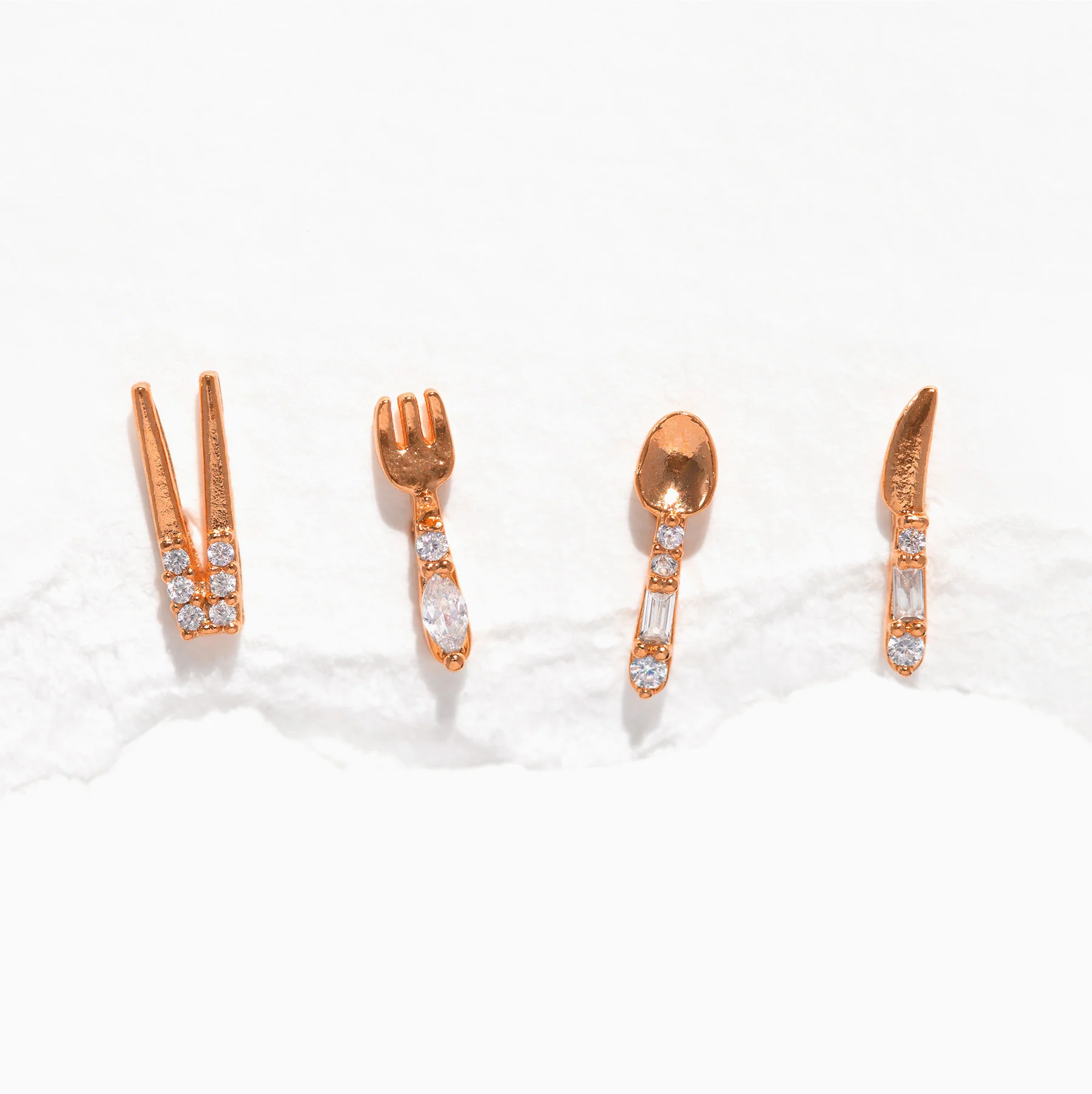 Serving you a spoonful of style with our Table for One Stud Set! Featuring a mismatched set of a fork, spoon, knife, and chopsticks. Leaving you looking forkin' fabulous!